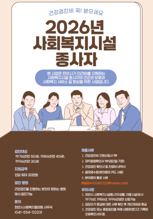 2026년 사회복지시설종사자 건강검진비 지원사업 안내 페이지 정보 작성자작성자 : 천사협 조회조회수 : 587회 작성일작성일 : 26-03-03 15:54 본문 2026년 사회복지시설종사자 건강검진비 지원사업 안내드립니다. 첨부파일 건강검진비 지원 신청서2026년 최신본.hwp (20.5K) 27회 다운로드 목록 이전글-사회복지시설 종사자 처우개선을 위한 '시립예술단 연계 문화·예술공연 관람' 지원 계획 26.03.16 다음글2026년 예산서 공고 25.12.31