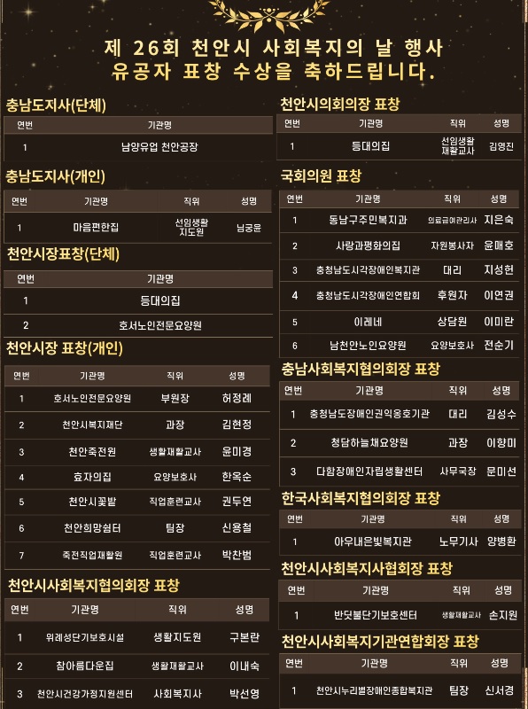 제 26회 천안시사회복지의 날 행사 유공자 표창수상 페이지 정보 작성자작성자 : 천사협 조회조회수 : 1,402회 작성일작성일 : 25-09-23 13:14 본문 수상을 축하 드립니다! 목록 이전글2025년 법인 정기 이사회의(2차) 개최 25.03.11 다음글「제26회 천안시사회복지의 날 행사」사회복지 유공자 추천 협조 요청 25.07.28